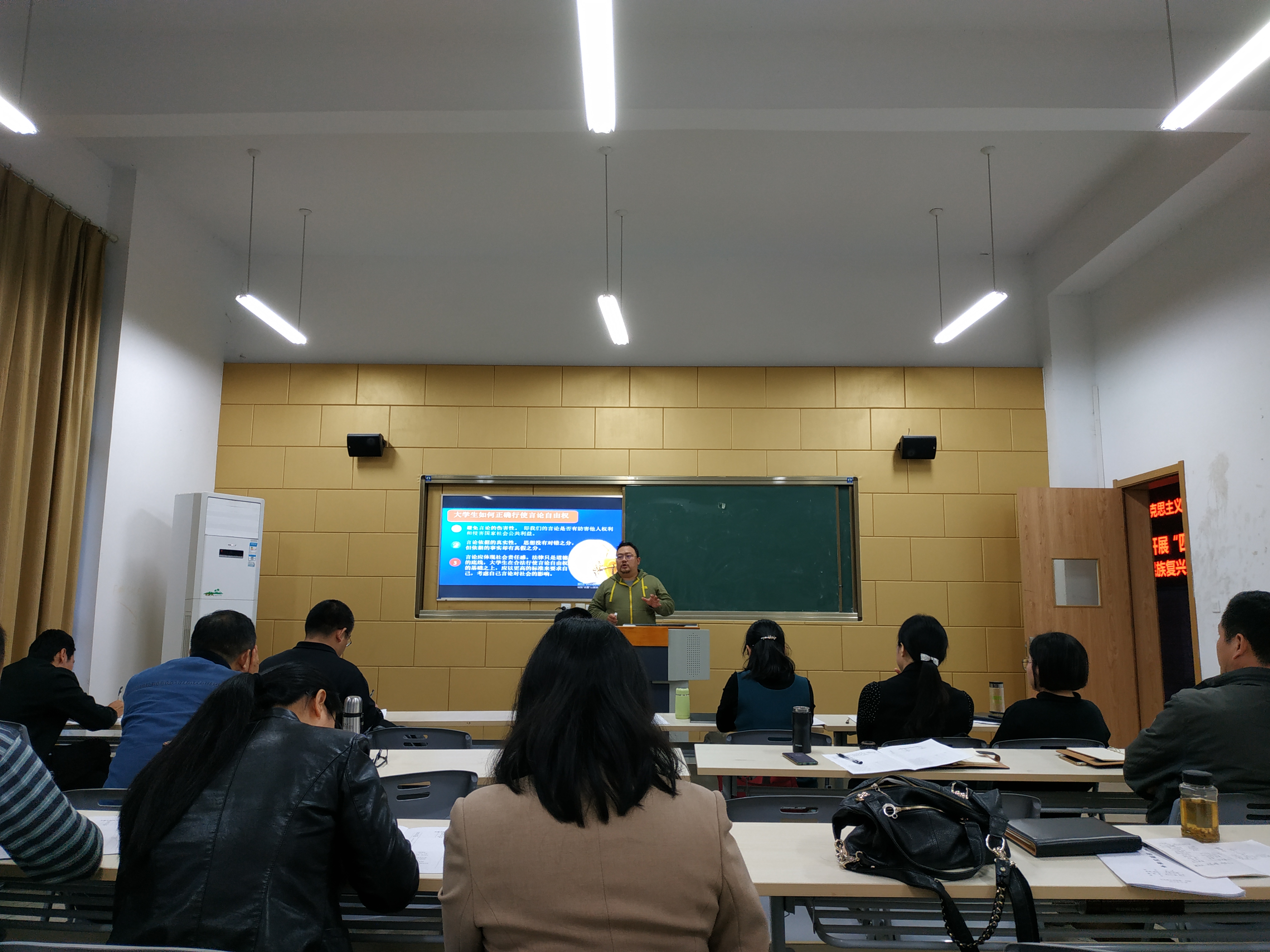 “中国近代史纲要”教研室凡樊老师,讲授了《近代史纲要》中“五四运动”专题,通过生动的图片展示,深入浅出地讲解了作为新民主主义革命开端的五四运动具体经过,并结合战疫中中国青年的担当作为,诠释了五四精神在当代的传承。“思想道德修养与法律基础”教研室许明华老师讲授了“行使法律权利的界限”专题,回顾了公民的基本权利,通过具体的案例牵引出大学生如何正确行使言论自由权。整个教学过程层次分明、节奏紧凑、重难点突出,将历史与当代、将法律与生活巧妙融合,充分调动了学生学习知识的积极性和主动性。两位教师的示范教学特色鲜明、逻辑性强,充分挖掘教材内容,材料运用得当、语言表达精炼、富有感染力,展现了学院思政课教师良好的教育教学素养。
