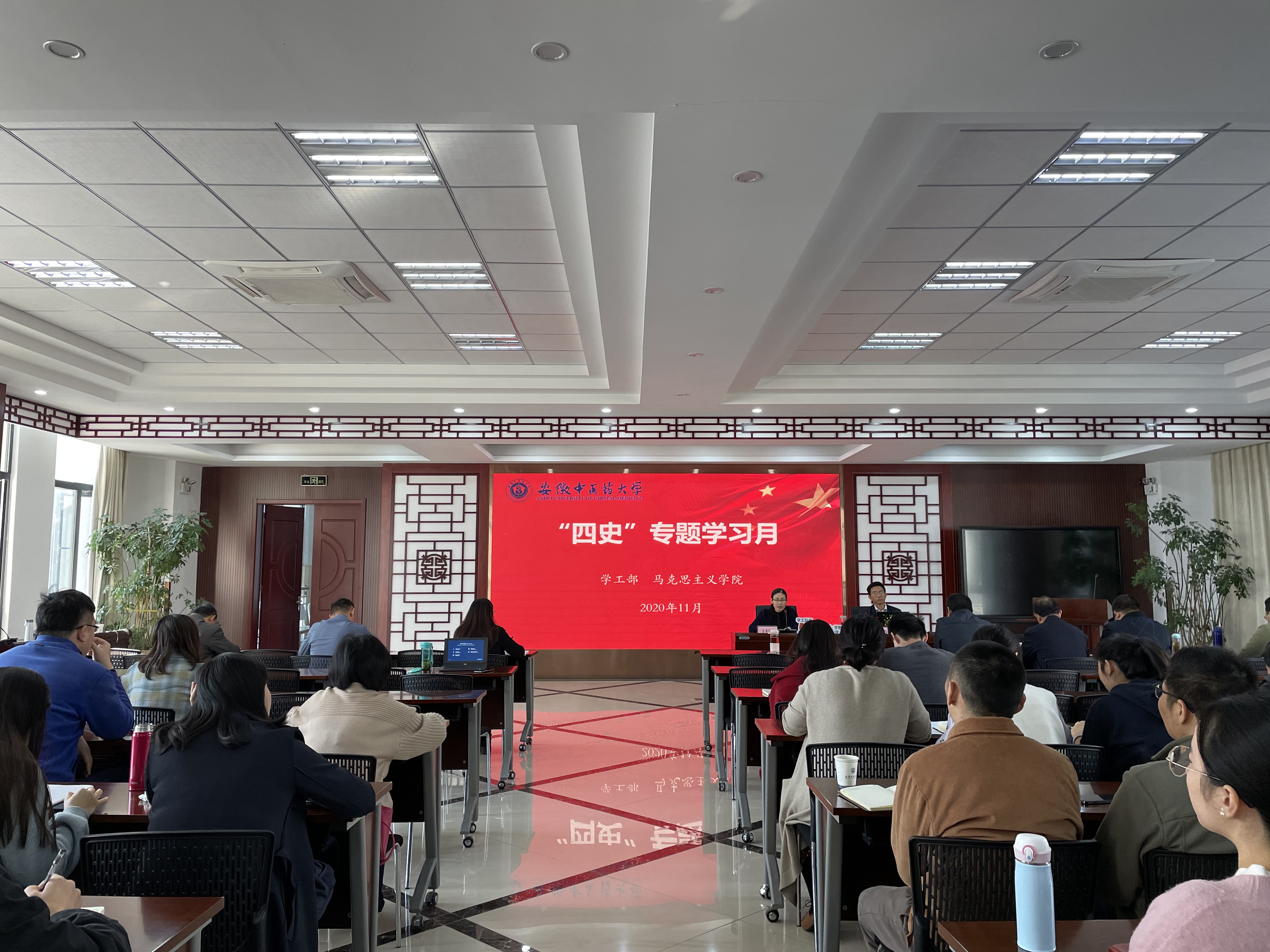 11月13日上午,学生处、马克思主义学院联合开展“四史”专题学习月专题报告会,马克思主义学院院长董玉节作《学习贯彻习近平总书记考察安徽重要讲话精神——落实立德树人根本任务》主题报告,全体学工队伍教师、马克思主义学院教师参加报告会,校学生处处长王红松主持报告会。