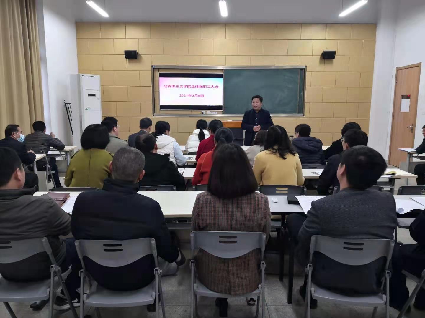 3月5日下午,学院召开新学期第一次全体教职工大会,部署开学初各项工作。会议由马克思主义学院党总支书记胡卿主持。