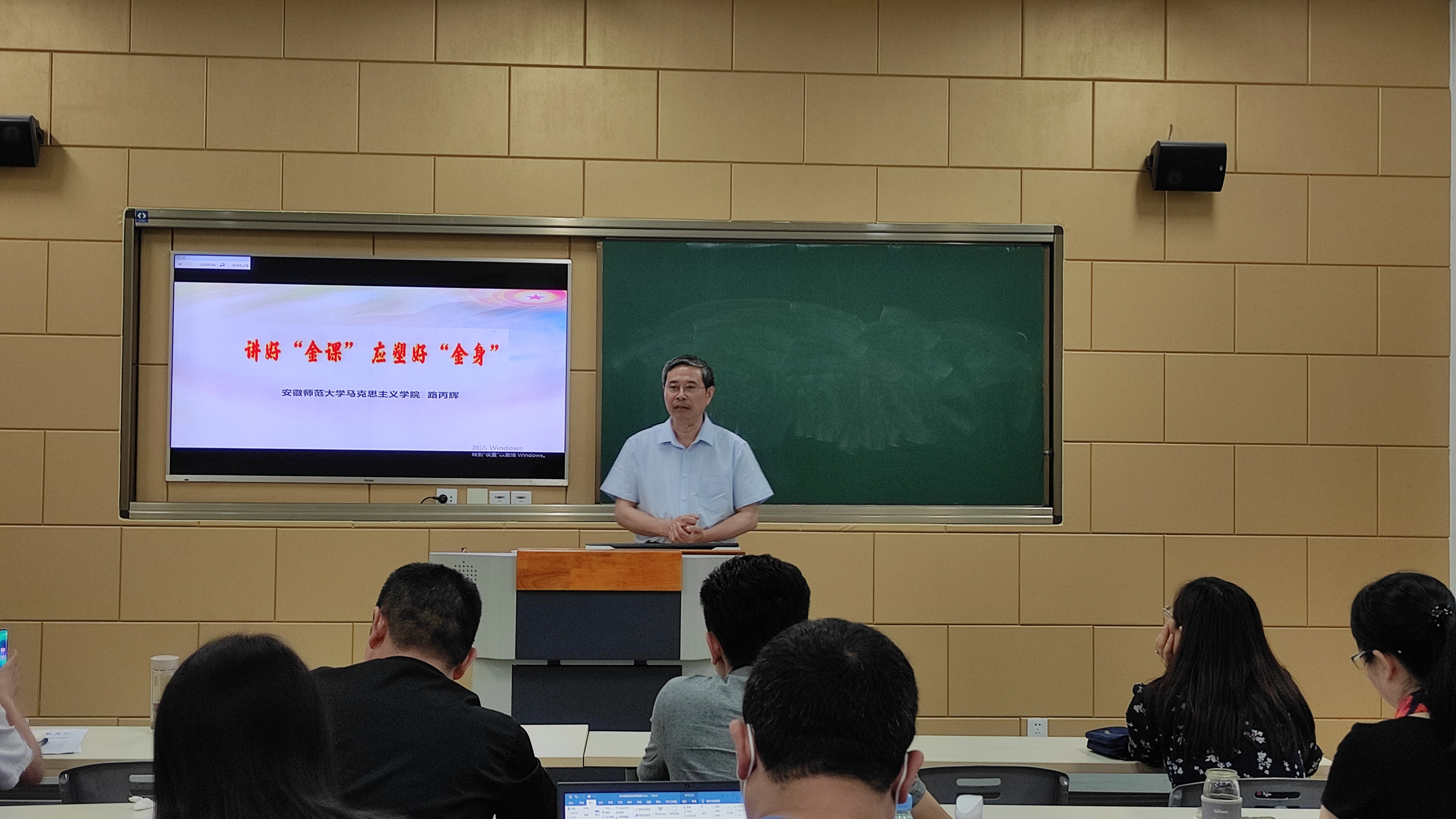 乐道守正,铸魂育人。6月2日,为切实加强思政课教师的政治建设,进一步提升教育教学的能力和水平,学院特邀安徽师范大学马克思主义学院教授、博士生导师、全国最美思政课教师路丙辉前来以“要讲好‘金课’,应塑好‘金身’”为题作专题讲座。马克思主义学院全体教职工、部分辅导员出席讲座。讲座由学院院长董玉节主持。
