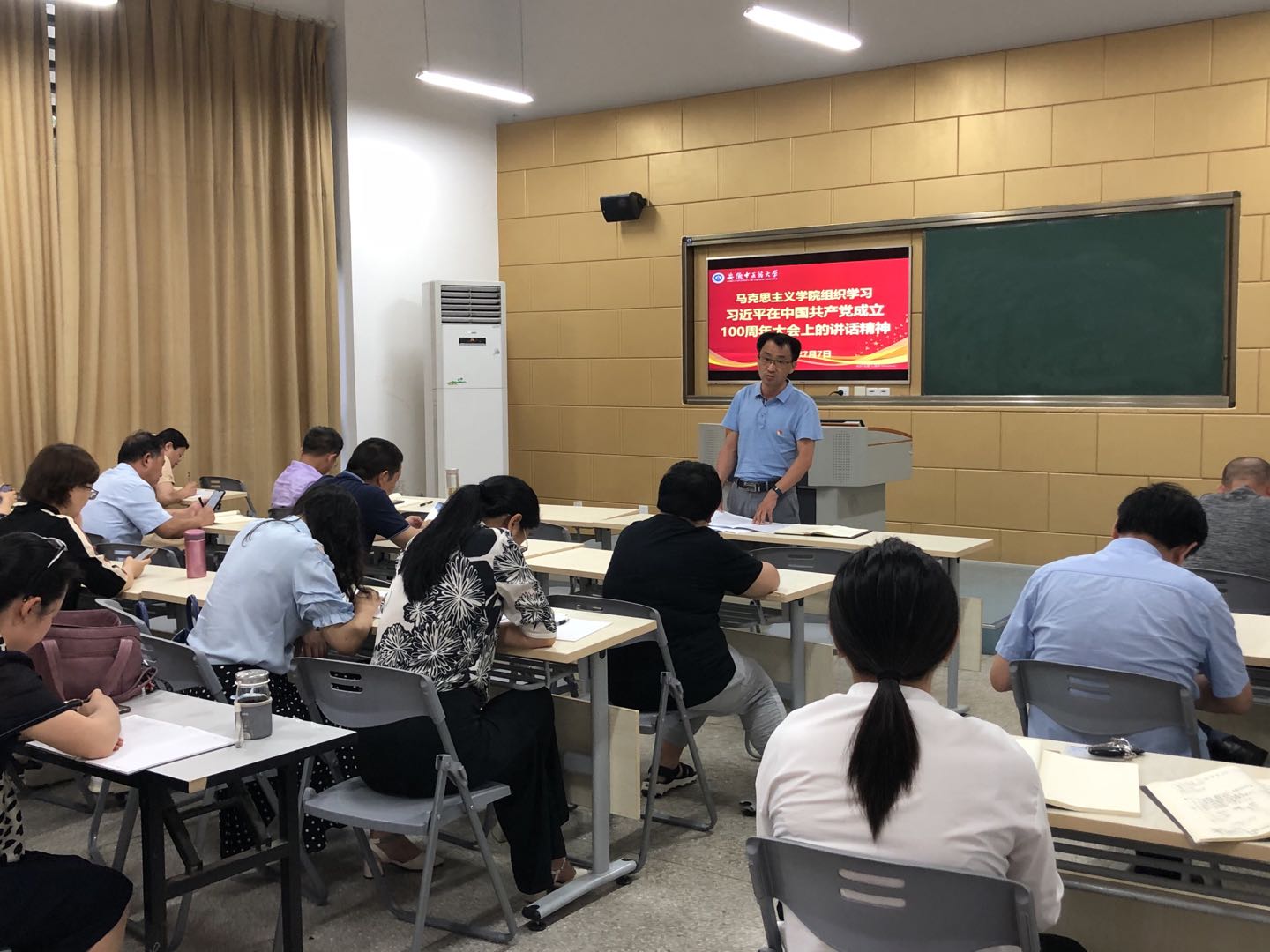 2021年7月7日下午,马克思主义学院召开全体教职工大会,传达学习习近平总书记在庆祝中国共产党成立100周年大会上的重要讲话精神,学院院长董玉节主持学习会。