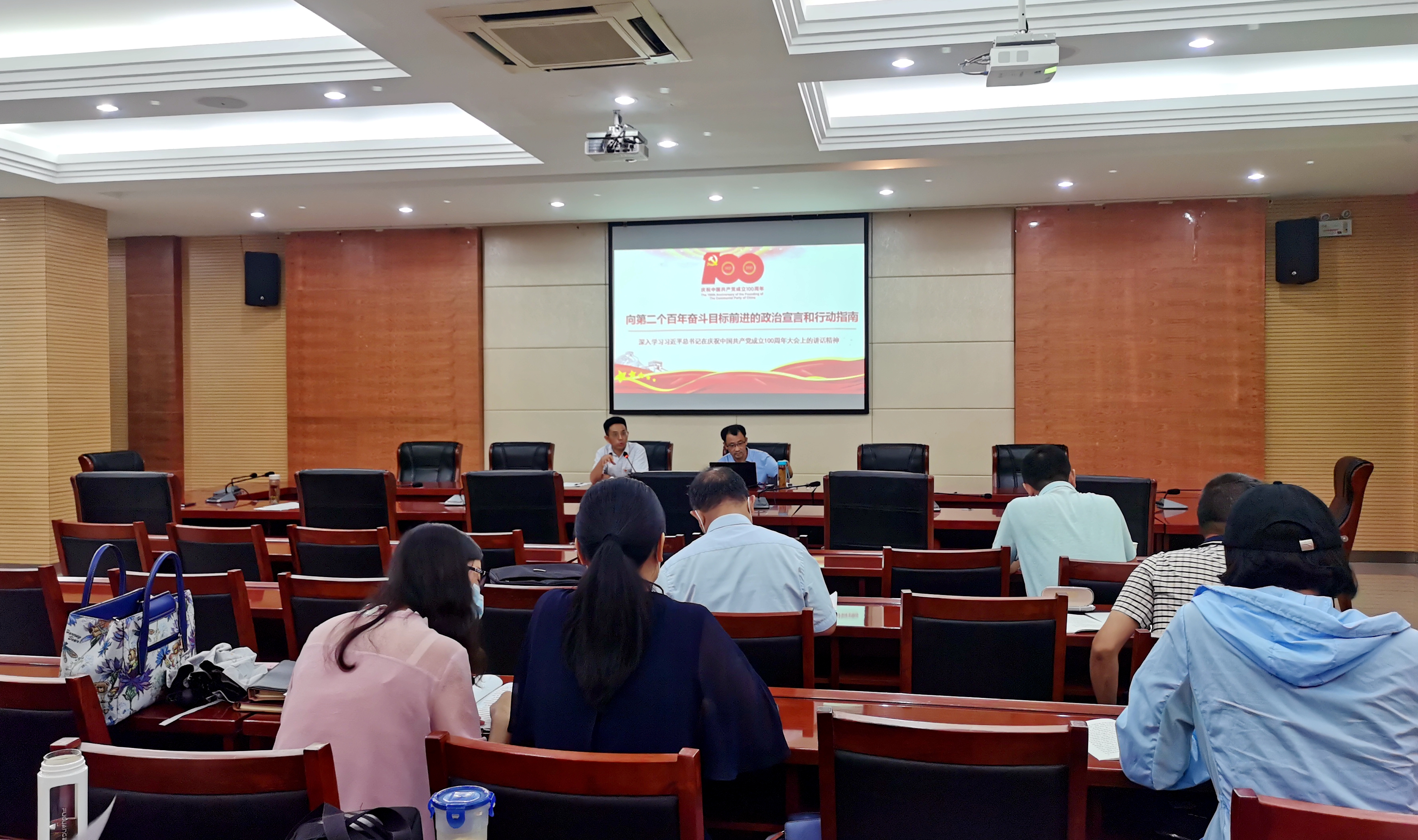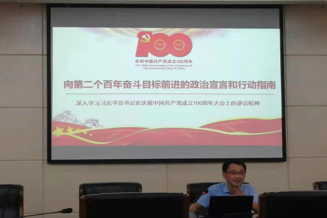 8月23日下午,为深入学习领会习近平总书记在庆祝中国共产党成立100周年大会上的重要讲话精神,马克思主义学院在梅山路校区新安楼一楼会议室开展学习领会习近平总书记 “七一”重要讲话精神专题党课活动,学院党总支书记黄学武以《向第二个百年奋斗目标前进的政治宣言和行动指南》为题作专题党课。学院院长董玉节主持专题党课活动,学院全体党员教师参会学习聆听。