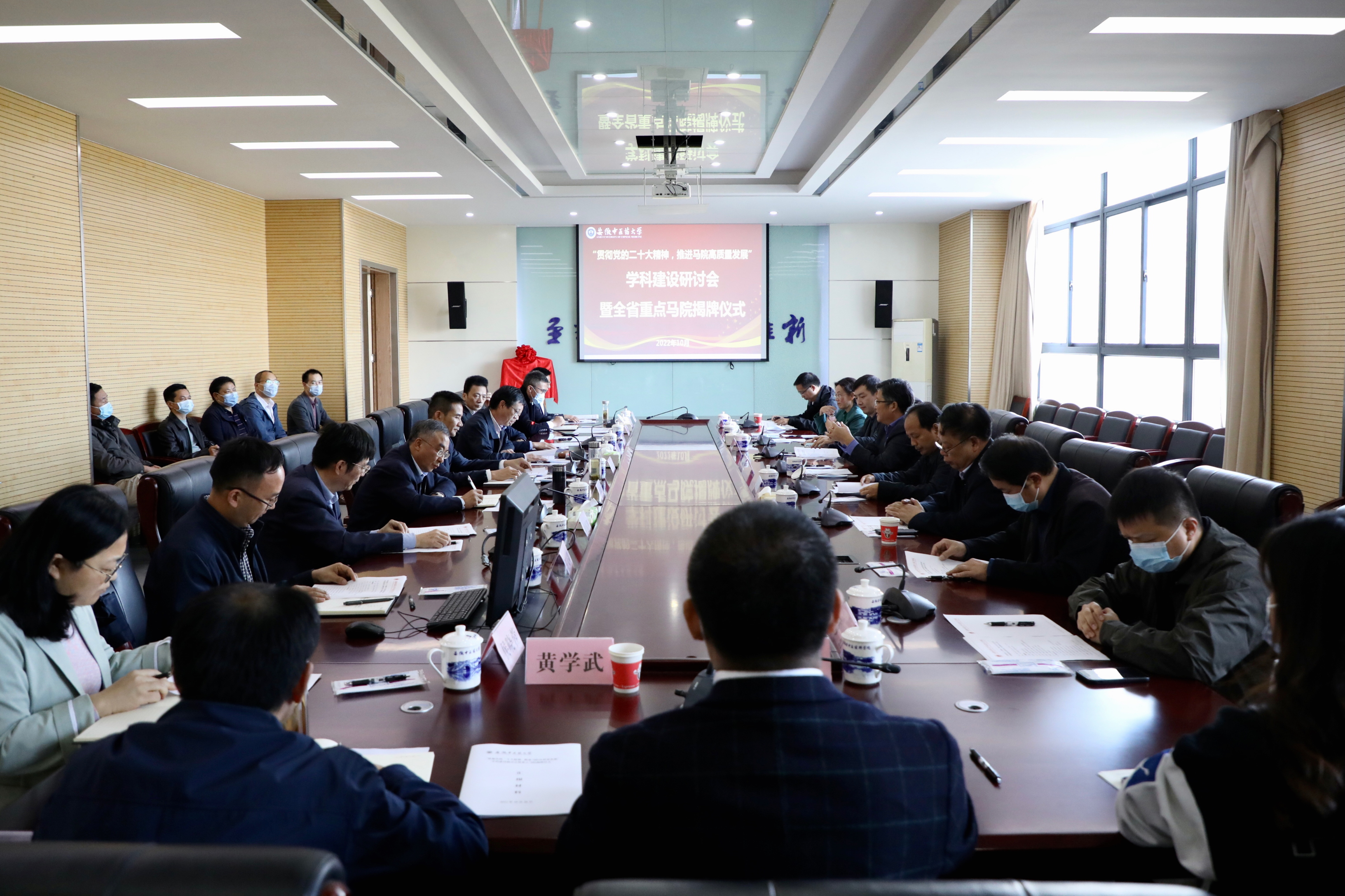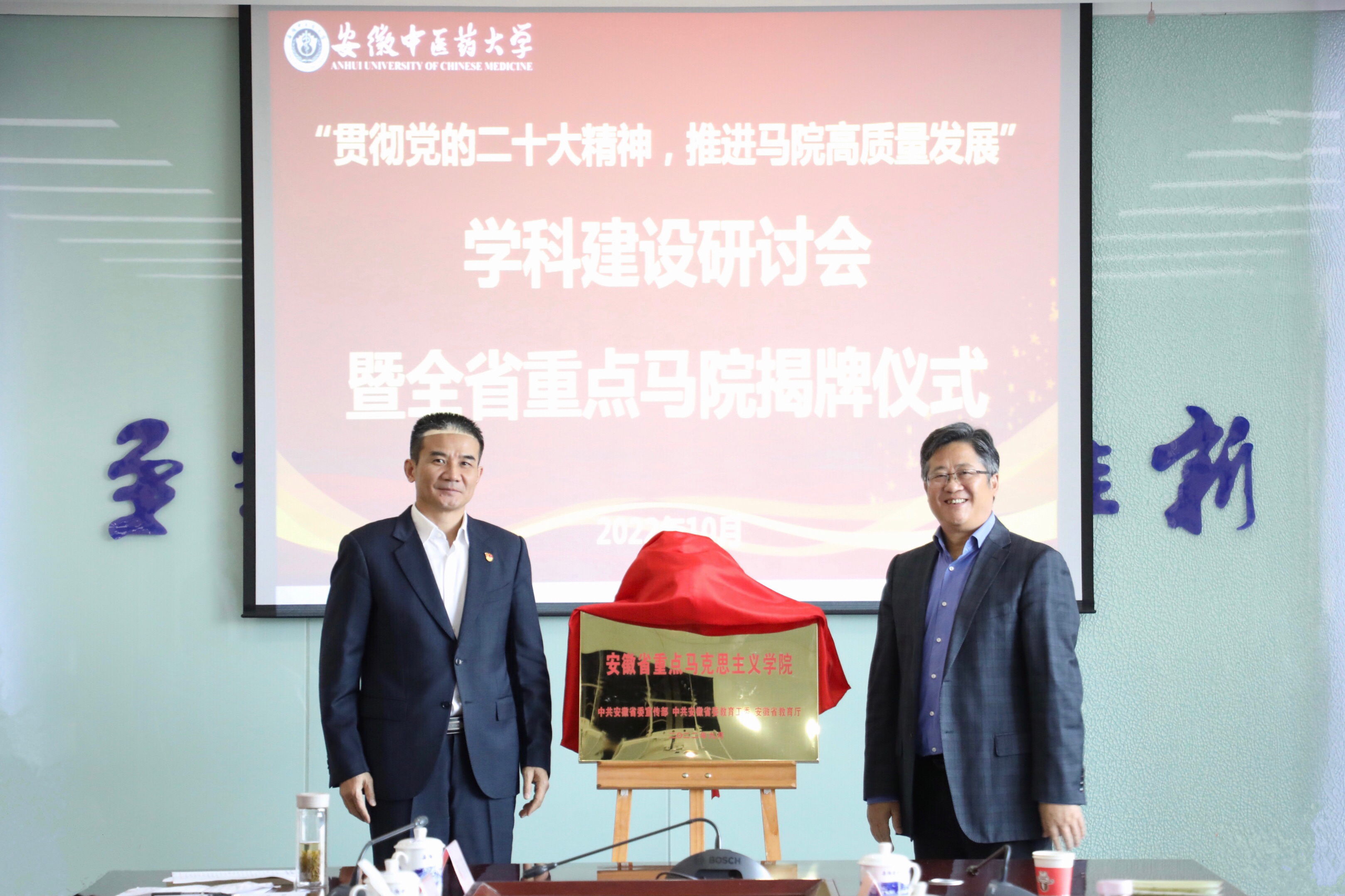 10月20日下午,我校马克思主义学院召开“贯彻党的二十大精神,推进马院高质量发展”学科建设研讨会暨省重点马院揭牌仪式。省委教育工委副书记王佩刚,省委宣传部理论处处长唐国富,省教育厅思政处调研员徐波,合肥工业大学习近平新时代中国特色社会主义思想研究院院长黄志斌,安徽大学、安徽农业大学、安徽医科大学马克思主义学院院长吴学琴、黄洪雷、柳泽民,学校党委书记王琦,学校原党委书记、全省高校思政课教指委主任、省马克思主义学会会长王先俊,学校党委副书记张永群,学校党委常委、宣传部部长吴达武及学科办、人事处、教务处、科技处、研究生院的部门负责人,马院班子成员、全体教授、全体教研室主任和支部书记出席研讨会。会议由张永群主持。