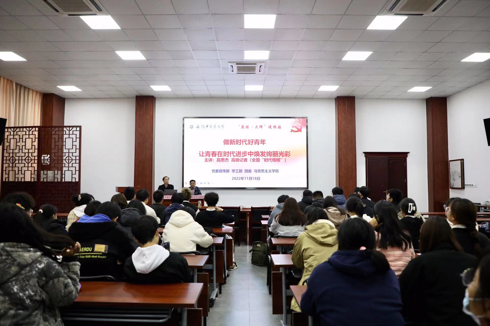 11月18日下午,由学校党委宣传部、学工部、团委、马克思主义学院主办,马克思主义学院承办的“英模·大师”进校园专题报告会在少荃湖校区举行。全国优秀共产党员、时代楷模、全国基层理论宣讲先进个人、全国优秀新闻工作者、中国好人、安徽省道德模范、阜阳师范大学马克思主义学院党委书记高思杰应邀为我校师生作题为《做新时代好青年 让青春在时代进步中焕发绚丽光彩》的报告。各学院及有关部门负责人,各学院学生代表、全体思政课教师、全体专兼职辅导员线上线下共同聆听报告。报告会由马克思主义学院院长董玉节主持。