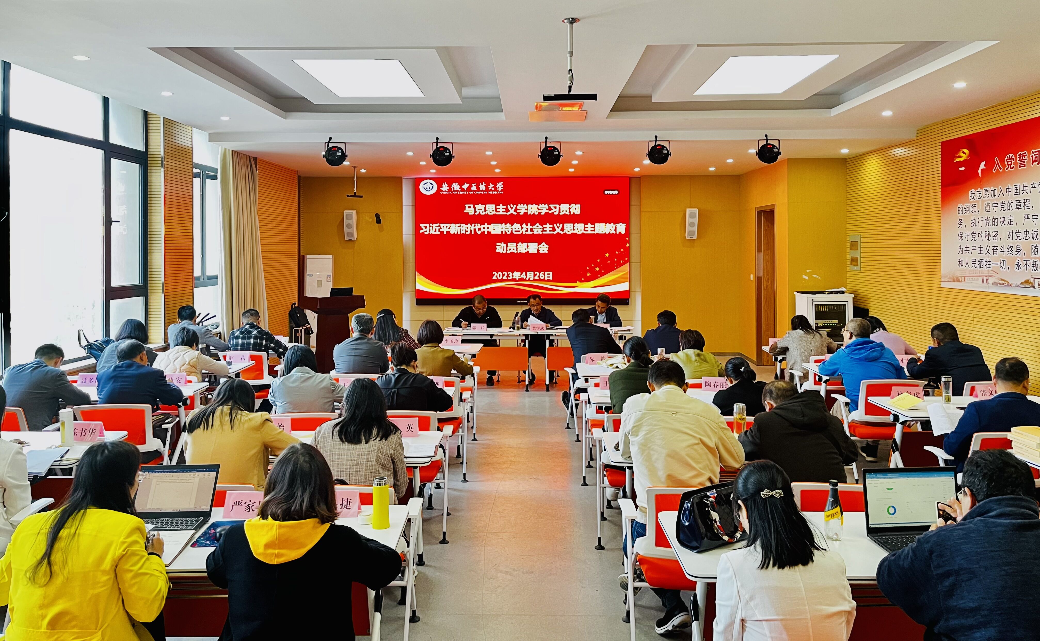 黄学武强调,开展学习贯彻习近平新时代中国特色社会主义思想主题教育,是党中央为全面贯彻党的二十大精神、动员全党同志为完成党的中心任务而团结奋斗所作的重大部署。全院上下要积极学习宣传贯彻习近平新时代中国特色社会主义思想,深刻领会和把握主题教育的重大意义、总要求、根本任务、具体要达到的目标和着力解决的问题,把学习贯彻习近平总书记重要讲话重要指示精神特别是关于中医药工作、高等教育、思想政治理论课建设的重要论述作为主题教育的重要内容,聚焦“立德树人”根本任务落实,立足思政课教师职责要求,在落实学校党委“一改两为三提升”工作部署和聚焦学校“振兴中医药,建设‘双一流’”建设中做出马院应有贡献。(尤志成/文图 黄学武/审核)