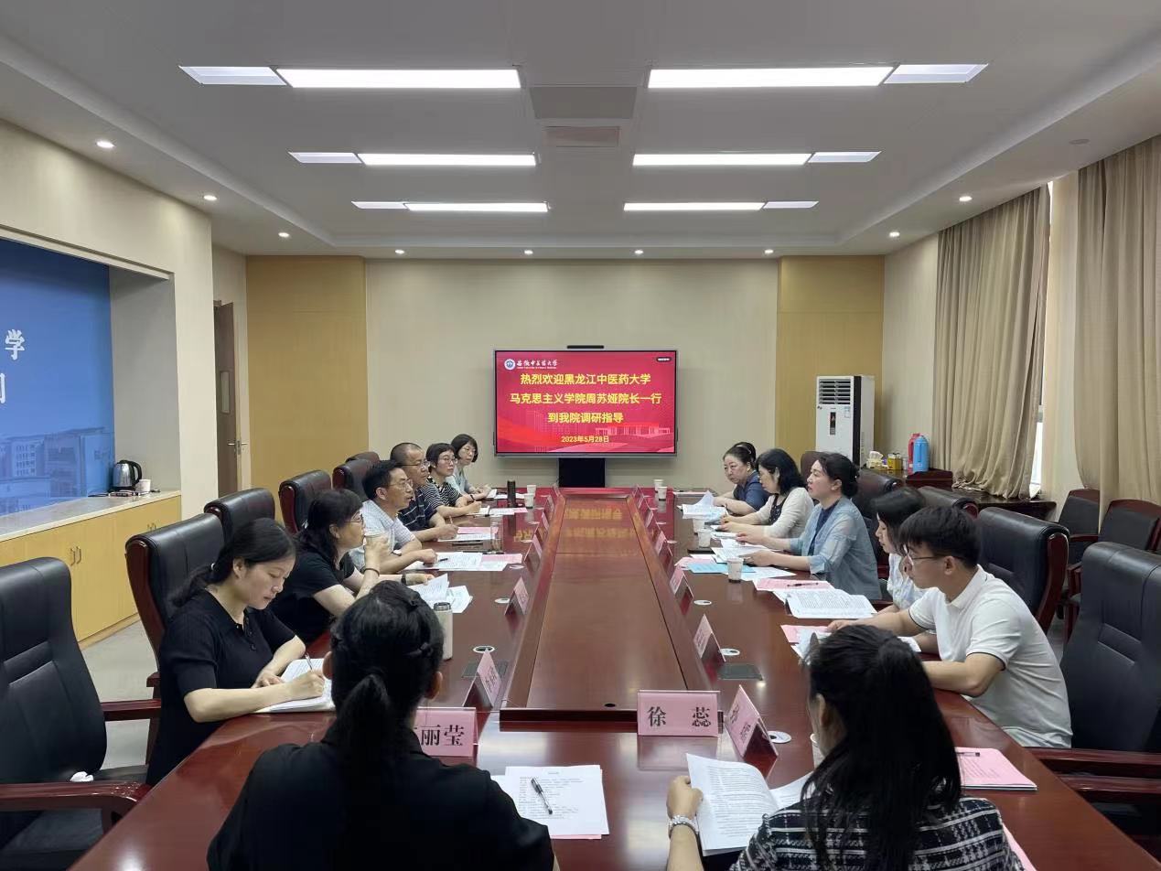 5月28日下午,黑龙江中医药大学马克思主义学院院长周苏娅一行8人到访马克思主义学院。学院院长董玉节、副院长郭跃、研究生思政课教研室主任解莉、马克思主义中国化教研室主任梁祥凤、副主任胡静娴、教学科研科负责人李玉玲参会,郭跃主持座谈会。