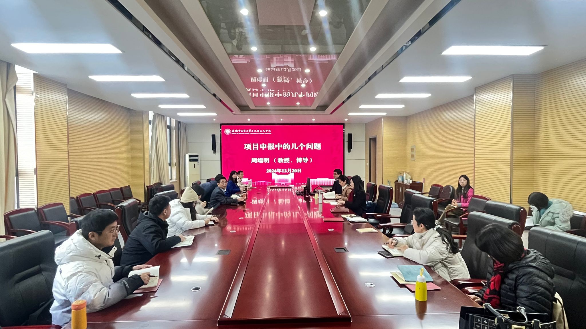 周端明教授首先对各级各类人文社科项目情况进行了介绍,他以自身对国内语言经济学的开拓研究为例,提出了学术研究的四个层次,指出一个好的选题必须要以研究新理论、运用新方法和解决新问题为出发点,始终要把问题意识和创新意识作为研究的核心。围绕人文社科项目的申报,周端明教授结合具体实例,从选题与题目、选题依据和意义、研究目标与内容、研究方法与技术线路、其他撰写内容五个方面对项目申报书的撰写进行系统性分析和讲解。周端明教授强调项目申报既要具有屡败屡战的决心,又要具有字句斟酌的细心。周端明教授指出项目的选题要注意与中医药文化相结合,研究者要有敏锐的眼光,善于发现真问题、研究真问题、进而解决真问题。
