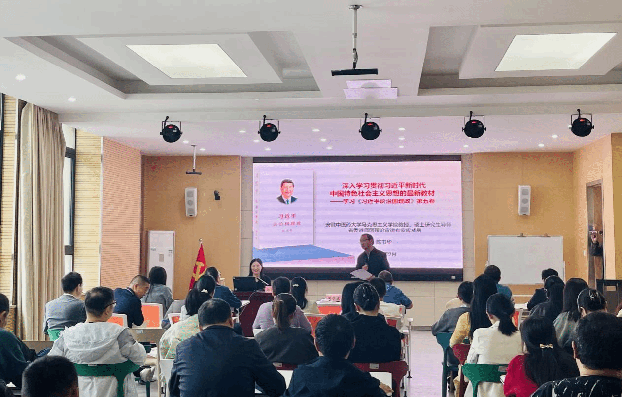 陈书华以“深入学习贯彻习近平新时代中国特色社会主义思想的最新教材——学习《习近平谈治国理政》第五卷”为题,围绕为什么学、学什么、如何学三个维度,对《习近平谈治国理政》第五卷的专题框架、主要内容和鲜明特色进行了全面、深入、系统的讲解和阐述。整场报告主题突出、逻辑严密,层层递进,对引导党员干部、思政课教师深入学习《习近平谈治国理政》第五卷,深刻领悟习近平新时代中国特色社会主义思想的真理力量和实践伟力起到了积极的促进作用。