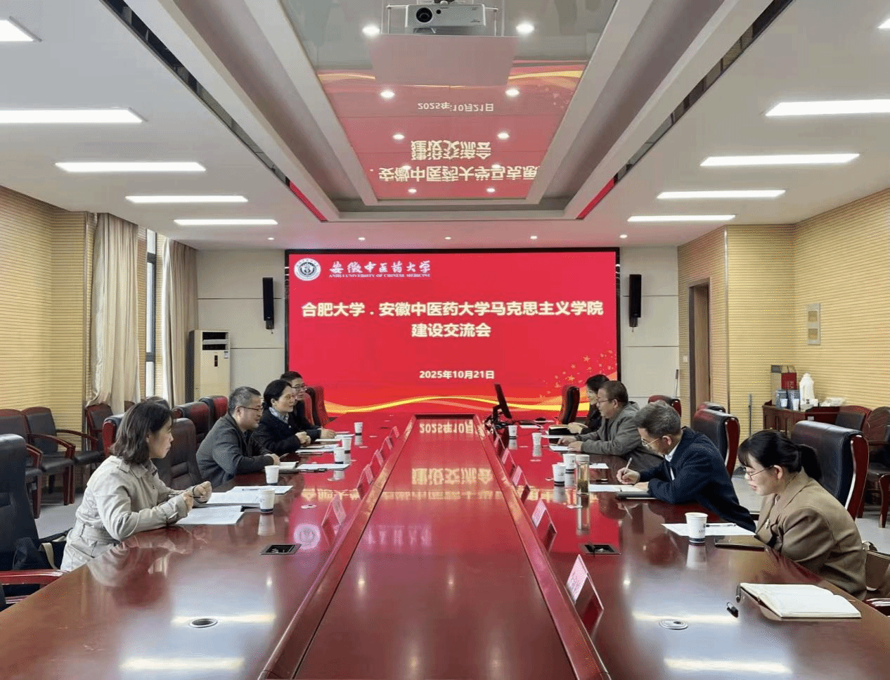 10月21日下午,合肥大学马克思主义学院党委书记鲁先瑾,党委副书记、院长苏冰一行到学院调研学位点申报、思政课建设等。安徽中医药大学党委常委、宣传部部长、马克思主义学院院长董玉节,执行院长郭跃,马克思主义中国化教研室主任陶春丽,教学科研科副科长李玉玲等参加座谈,郭跃主持会议。