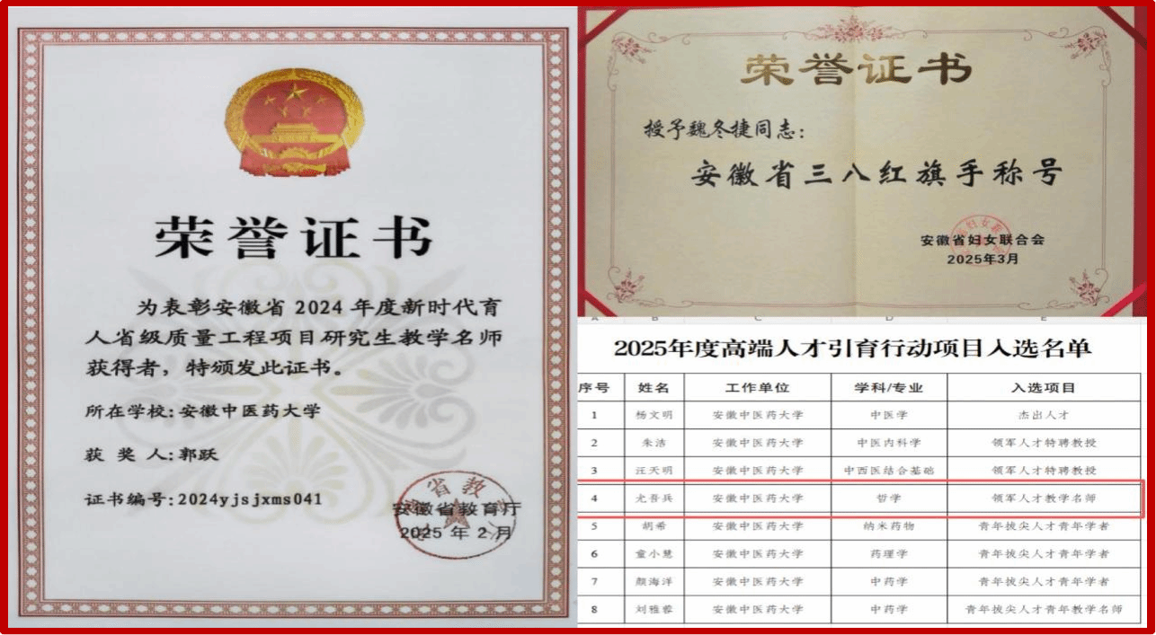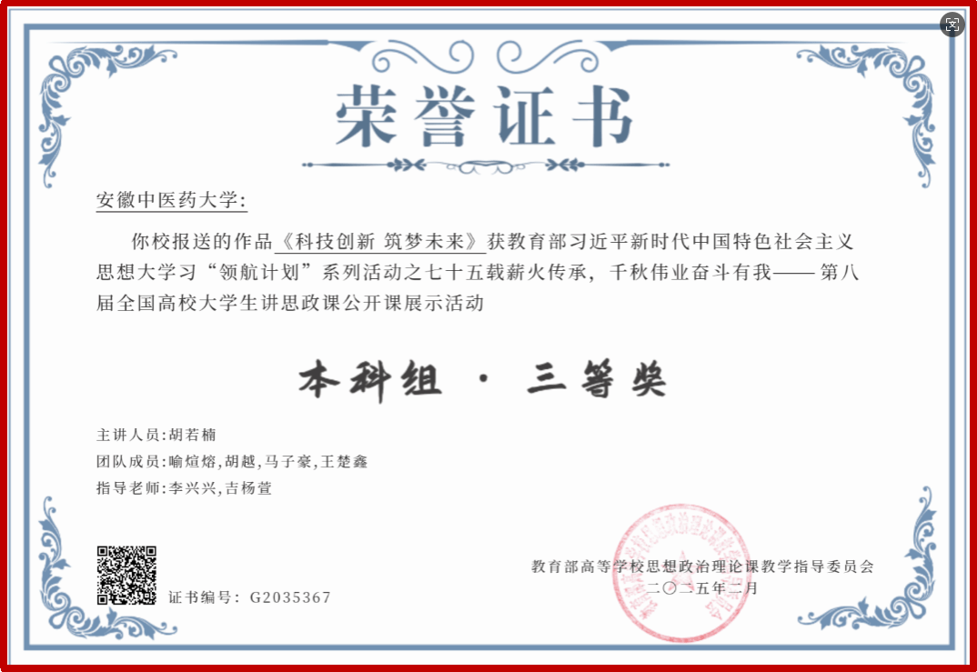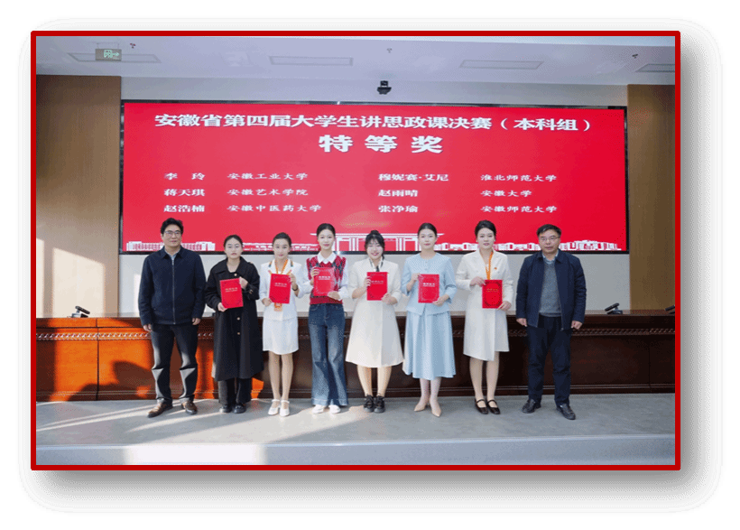 四、思政育人再获佳绩。在安徽省第四届大学生讲思政课决赛中,王华、项银霞老师指导的学生《以航天为镜,照见中国精神》(2024级药剂班赵浩楠、药学班蔡哲团队)获特等奖;李秋晨、尤志成老师指导的学生《从做眼的棋盘哲学看中国共产党的中流砥柱作用》(2024级中医5+3班张梦蕾团队)获三等奖。