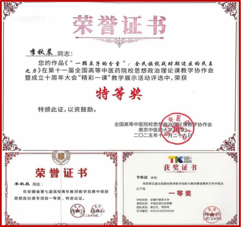 三、教学竞赛收获颇丰。坚持教学中心地位,高度重视青年教师教学能力培养与水平提升。2025年,青年教师李秋晨获第五届全国高校教师教学创新大赛安徽赛区决赛一等奖、安徽省第七届高校青年教师教学竞赛一等奖和全国高等中医药院校思想政治理论课建设经验交流暨第十一届教学协作会议“精彩一课”教学展示特等奖。