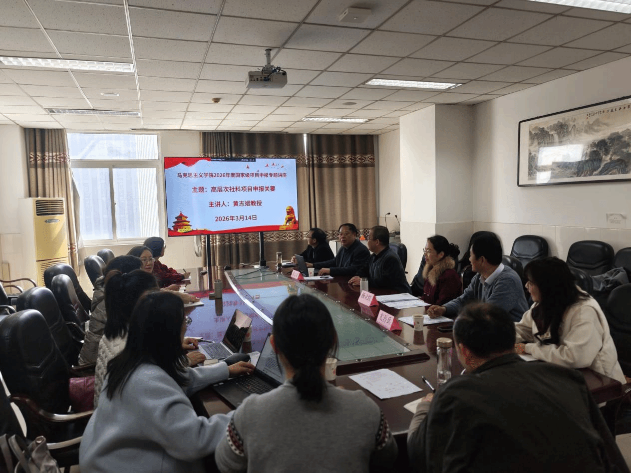 为做好2026年马克思主义学院国家级项目申报工作,加强教师申报书撰写指导,2026年3月14日下午,学院在东区新安楼八楼会议室举行专题辅导,特邀合肥工业大学马克思主义学院黄志斌教授作“高层次社科项目申报关要”专题讲座。学院拟申报2026年国家级项目的教师参加讲座会,本次讲座由执行院长郭跃主持。