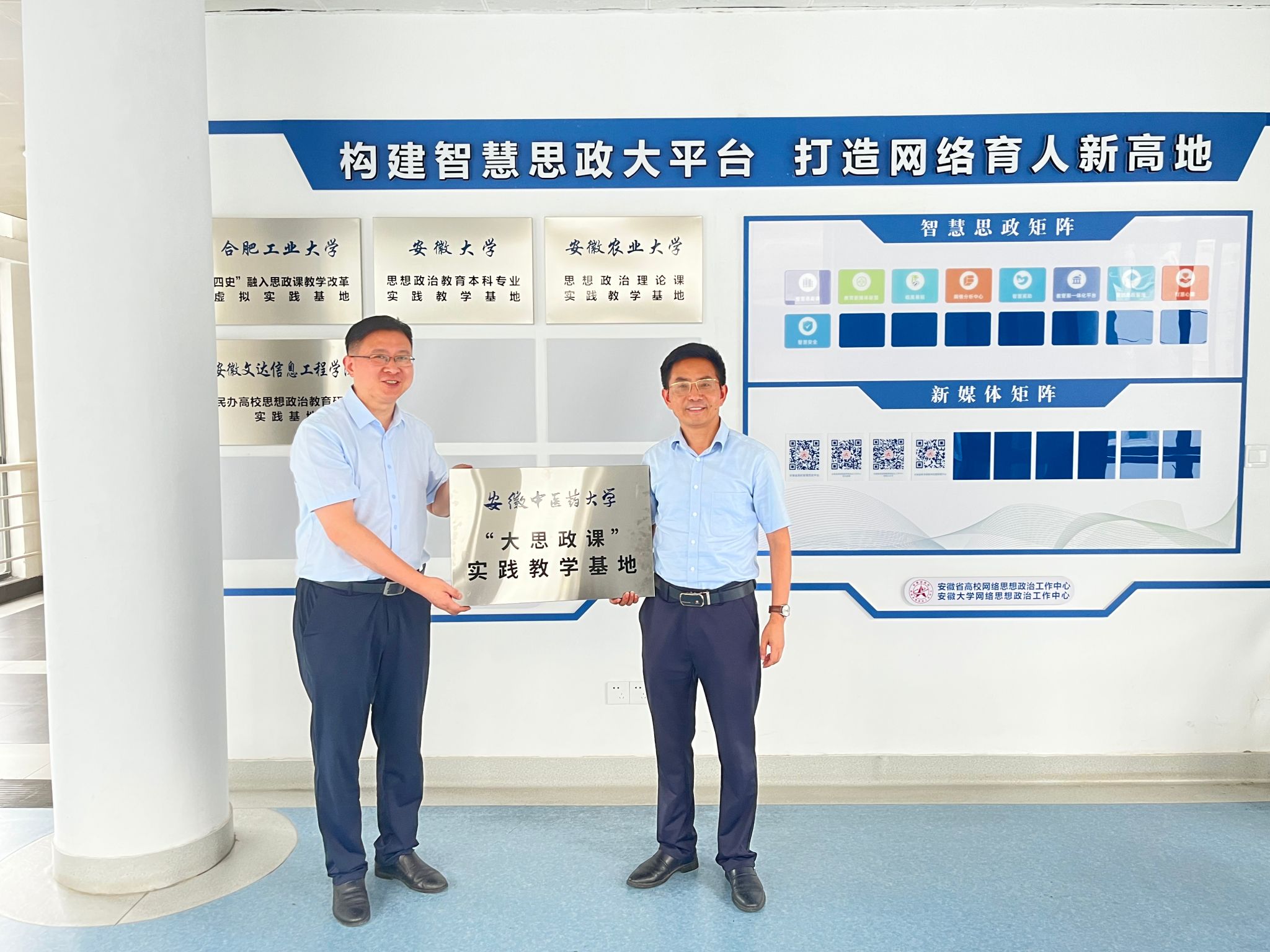 省高校网络思政中心常务副主任郑健和我校马克思主义学院董玉节院长共同为“安徽省高校网络思政中心安徽中医药大学‘大思政课’实践教学基地”揭牌。学校将与安徽大学继续加强深入交流,实现优势互补,资源共享,探索实践育人长效机制,深化教育教学效果,提高社会实践的质量和效果。
