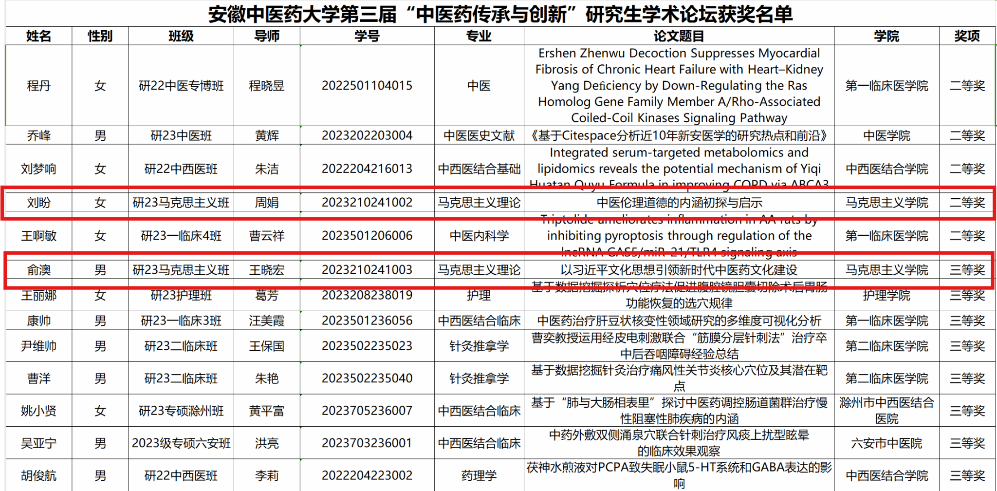 刘盼同学提交的《中医伦理道德的内涵初探与启示》一文获二等奖,俞澳同学提交的《以习近平文化思想引领新时代中医药文化建设》一文获三等奖。