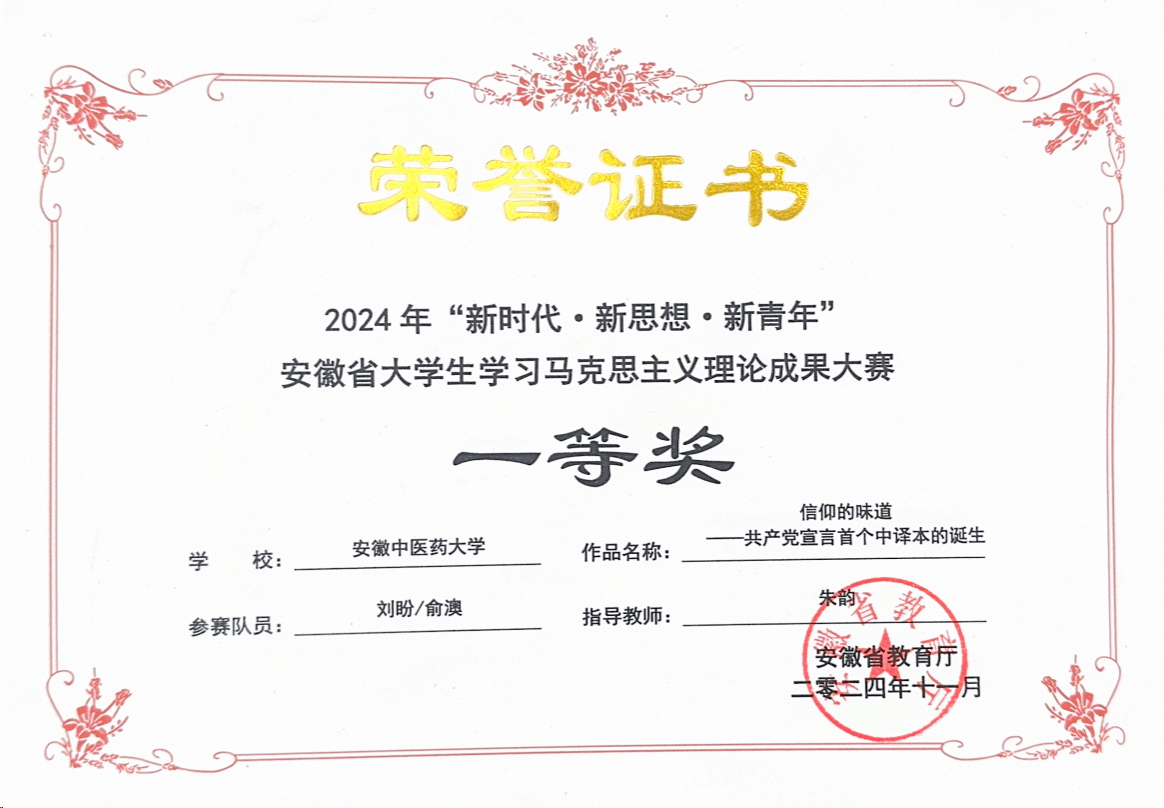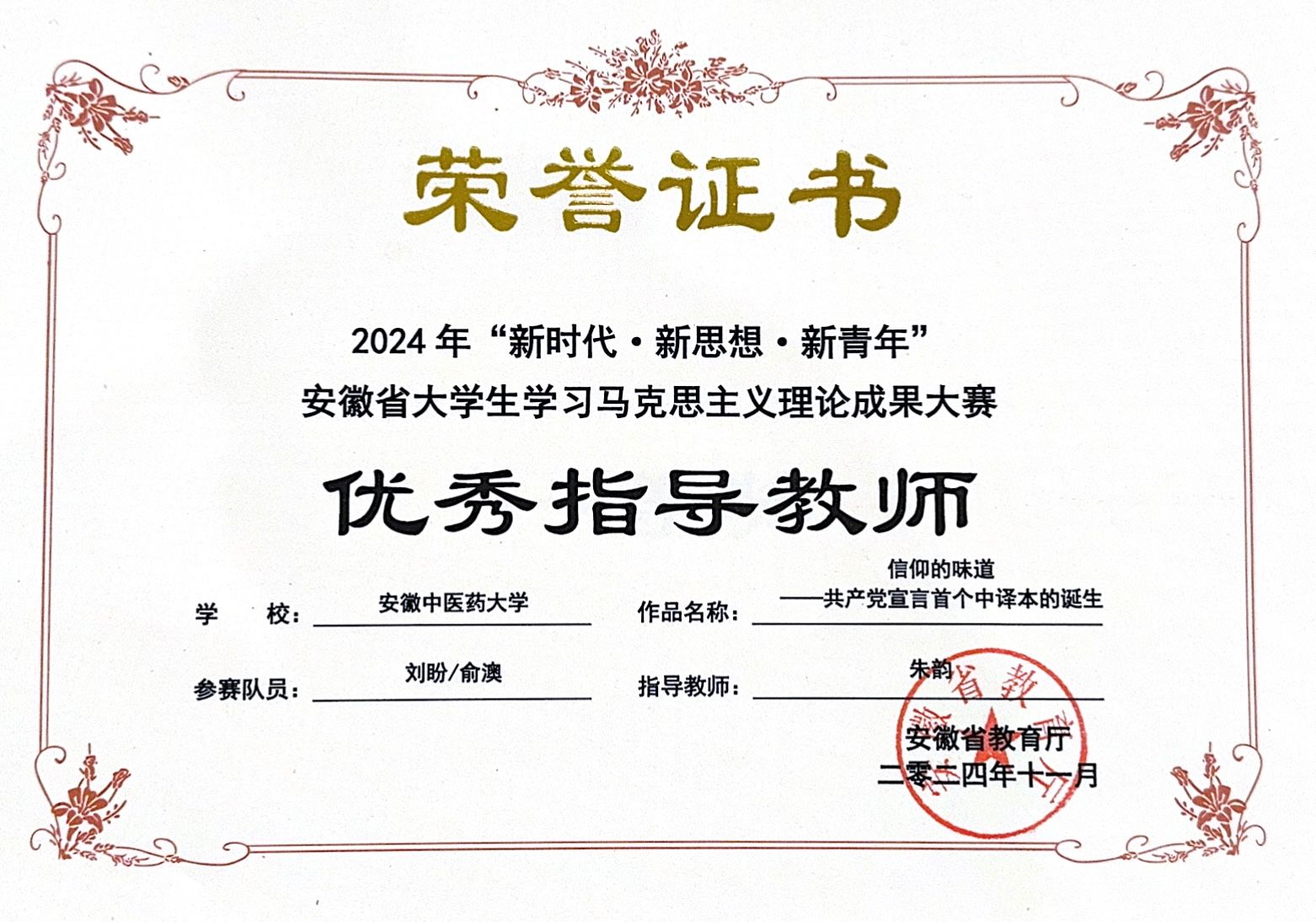 刘盼、俞澳的作品《信仰的味道——共产党宣言首个中译本的诞生》(指导教师:朱韵)获微视频类一等奖,朱韵获“优秀指导教师”称号。李仁辉同学的作品《矛盾的普遍性和特殊性原理视角下“两个结合”的必然性探析》(指导教师:尤吾兵)获论文类三等奖。