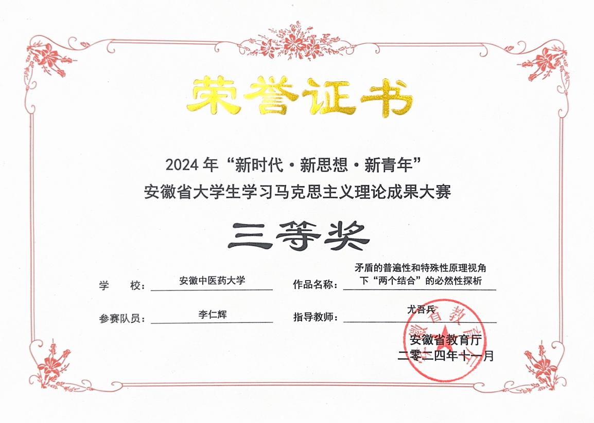 日前,由安徽省教育厅主办的2024年“新时代•新思想•新青年”安徽省大学生学习马克思主义理论成果大赛评审结果公布。本次大赛,经过各高校组织初赛推荐,共有来自全省73所高校的的309项报送作品。我院选送的作品获得一等奖1项、三等奖1项,1名教师获评优秀指导教师。